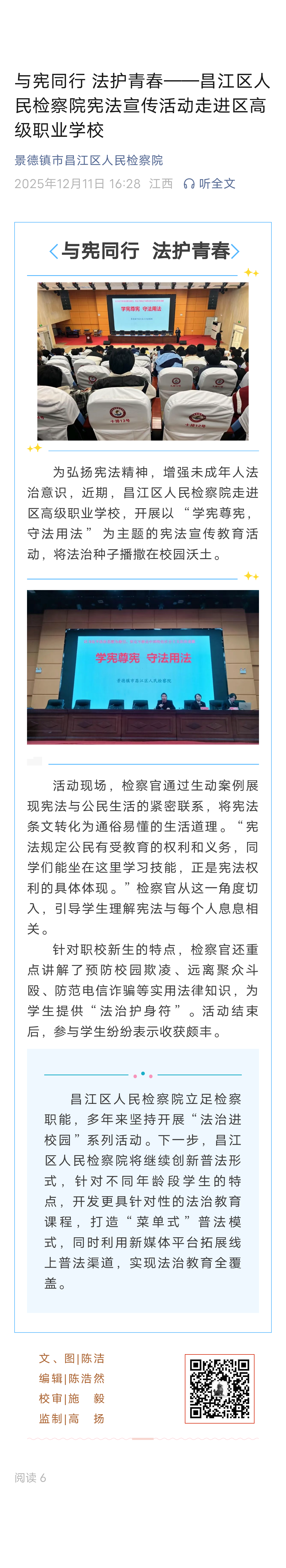 与宪同行 法护青春——昌江区人民检察院宪法宣传活动走进区高级职业学校