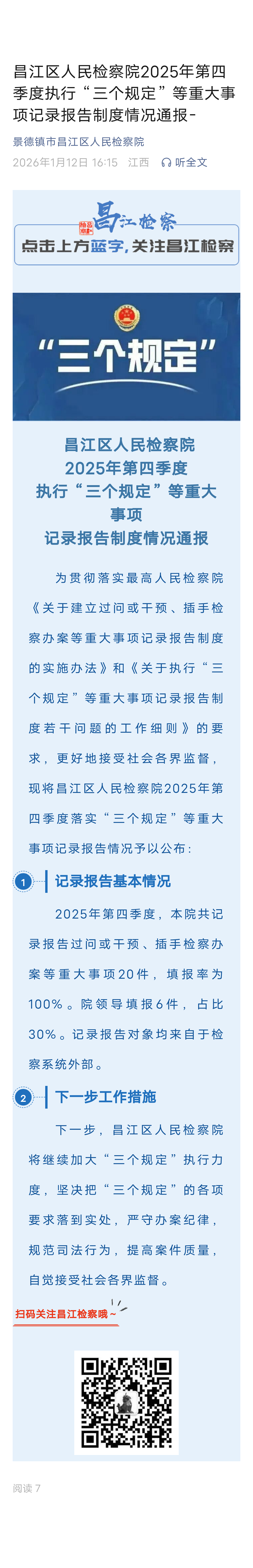 昌江区人民检察院2025年第四季度执行“三个规定”等重大事项记录报告制度情况通报