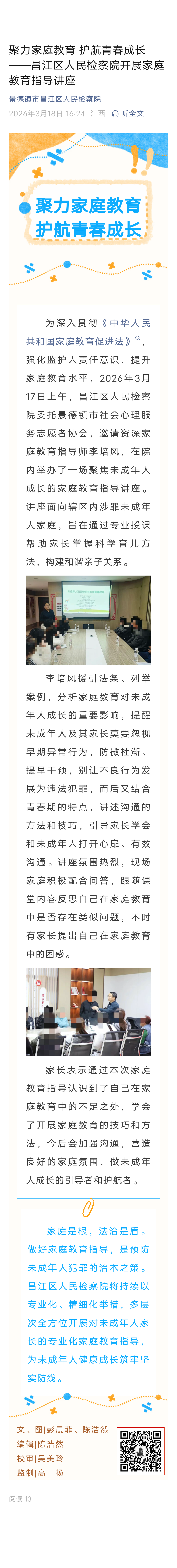 聚力家庭教育 护航青春成长 ——昌江区人民检察院开展家庭教育指导讲座